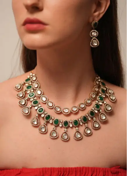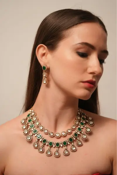 A two-layer Indian necklace set features an oval-cut uncut diamond chain on the first layer and emeralds on the second layer, completed with matching earrings, perfect for any wedding guest look!