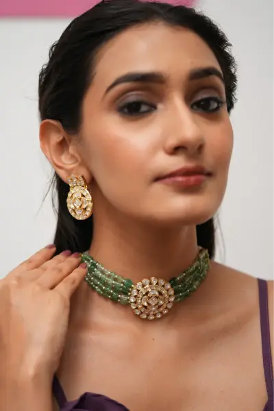 Each gemstone, set against the warm glow of 22k gold, becomes a focal point of refined beauty. This 22k gold jewelry set is a Virani Jewelers creation that goes beyond trends, inviting you to wear a piece of Indian gold jewelry that stands as a testament to timeless sophistication and enduring allure.