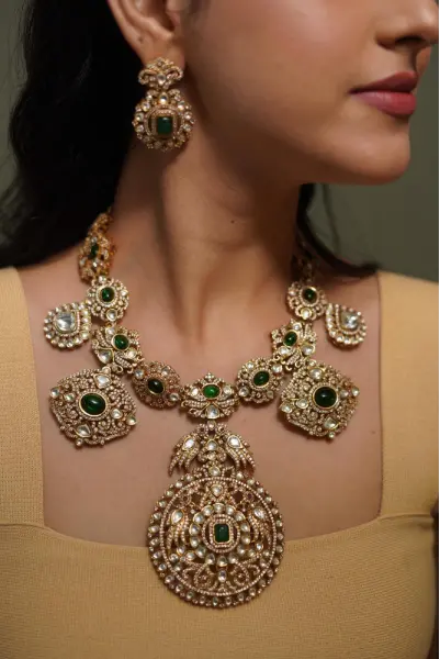 A matte antique gold set with polkis all over and a sprinkle of emeralds along with diamonds. Studded with the best and richest craftsmanship is this outstanding piece of jewellery.